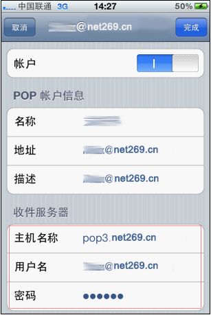 四、收件服務(wù)器中設(shè)置您的郵件服務(wù)器,賬號和密碼,郵件服務(wù)器您可以填寫“pop3.net269.cn”(也可以填寫pop3.您的域名,視您是否做得高級解析決定的):