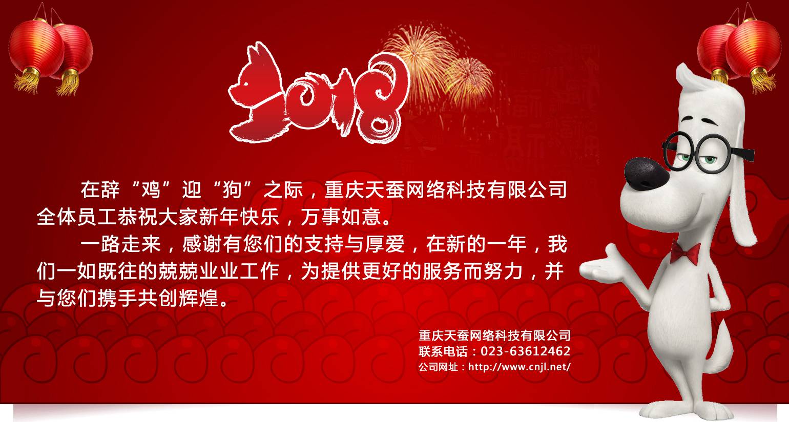 二、在2018年春節(jié)長(zhǎng)假到來之際,感謝大家支持和厚愛,在此重慶天蠶網(wǎng)絡(luò)科技有限公司的全體員工向您們致以節(jié)日的問候,祝您們新年快樂,生意興隆,家庭幸福。