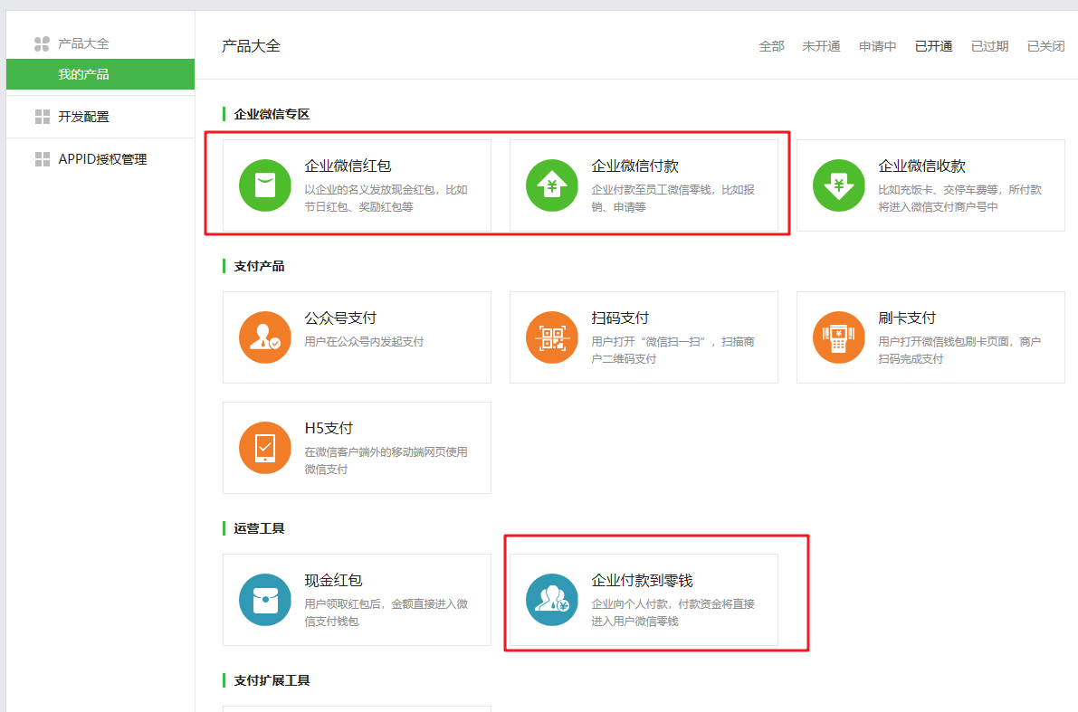 只需在微信支付商戶平臺(tái),產(chǎn)品中心,開通【企業(yè)微信付款】與【企業(yè)付款到零錢】,如下圖所示:
